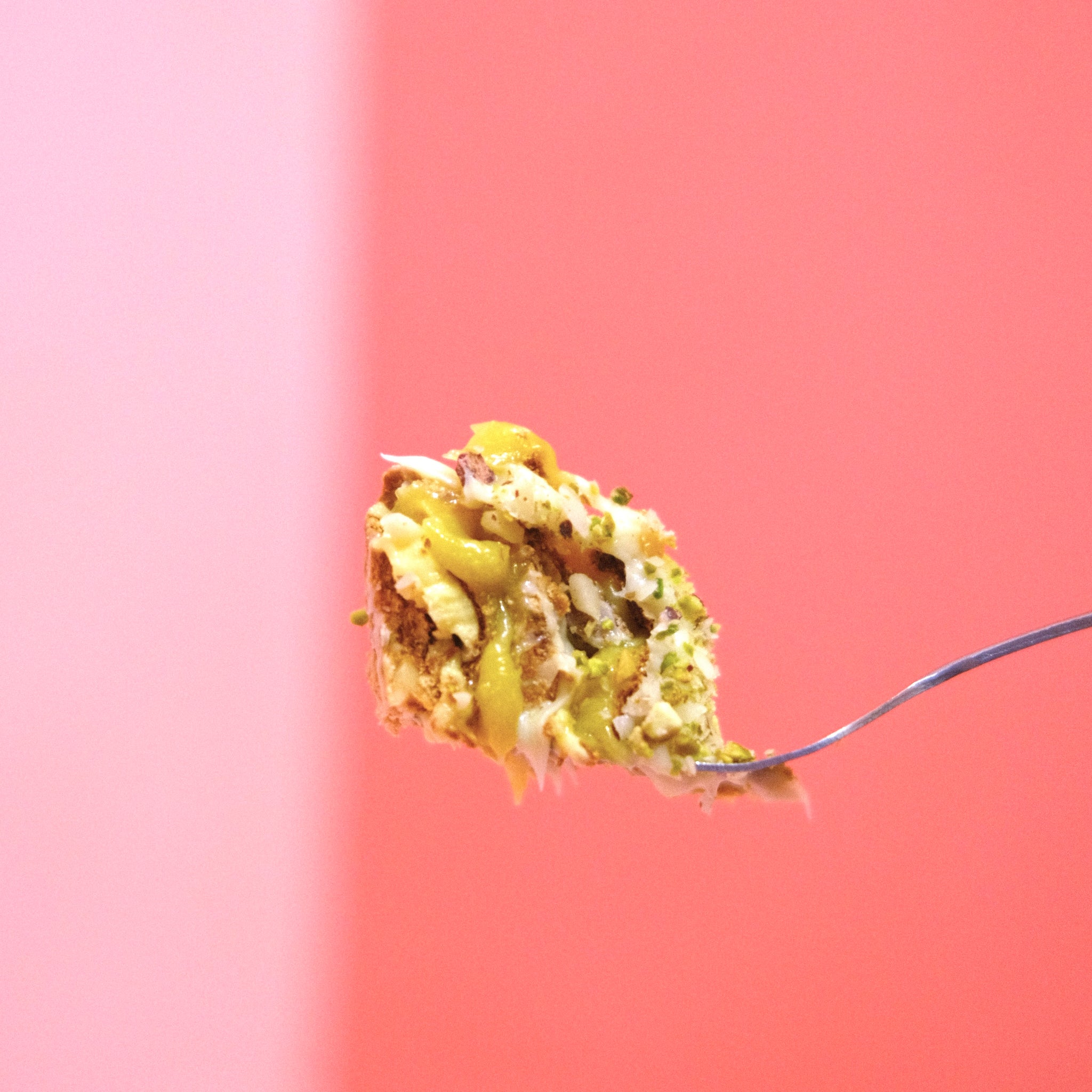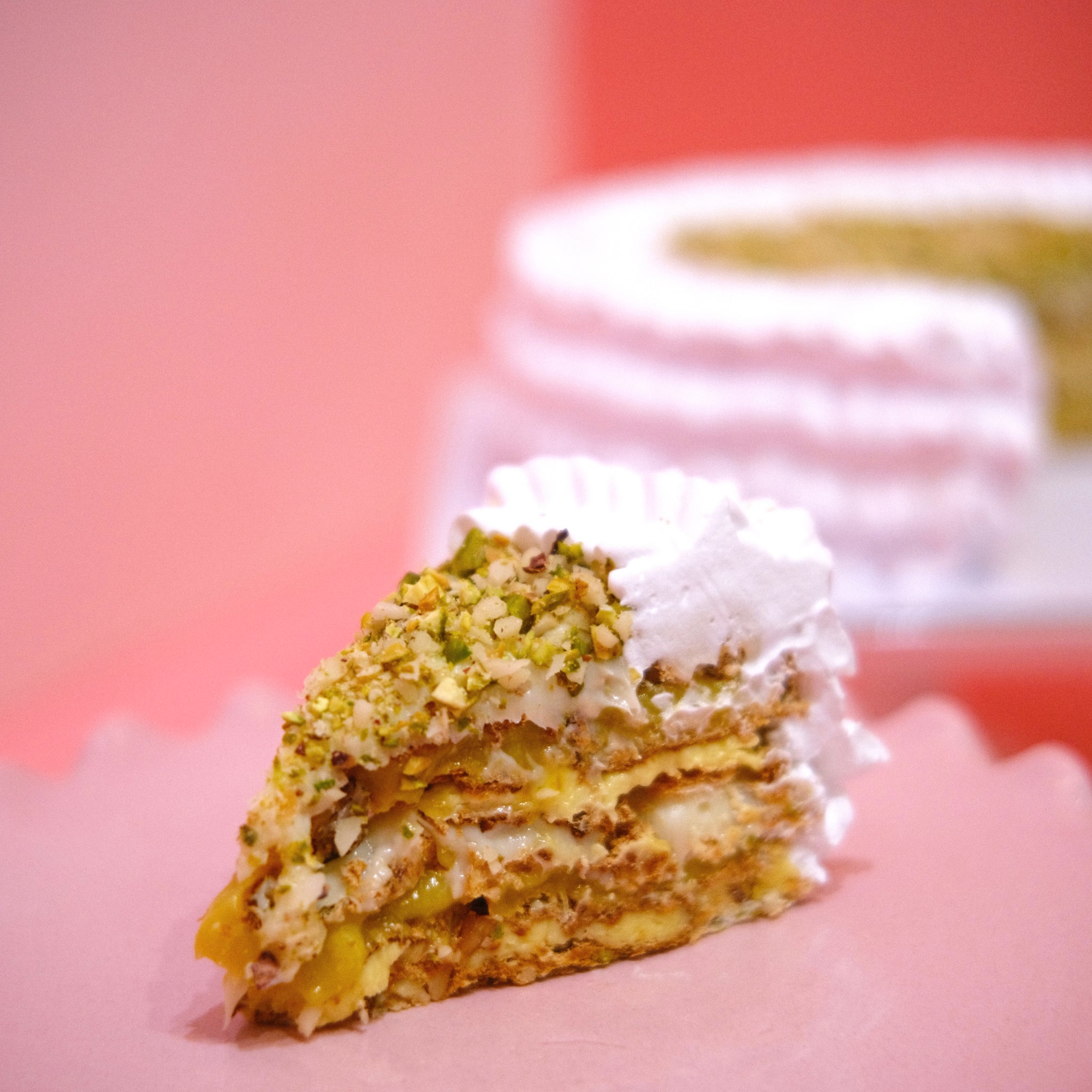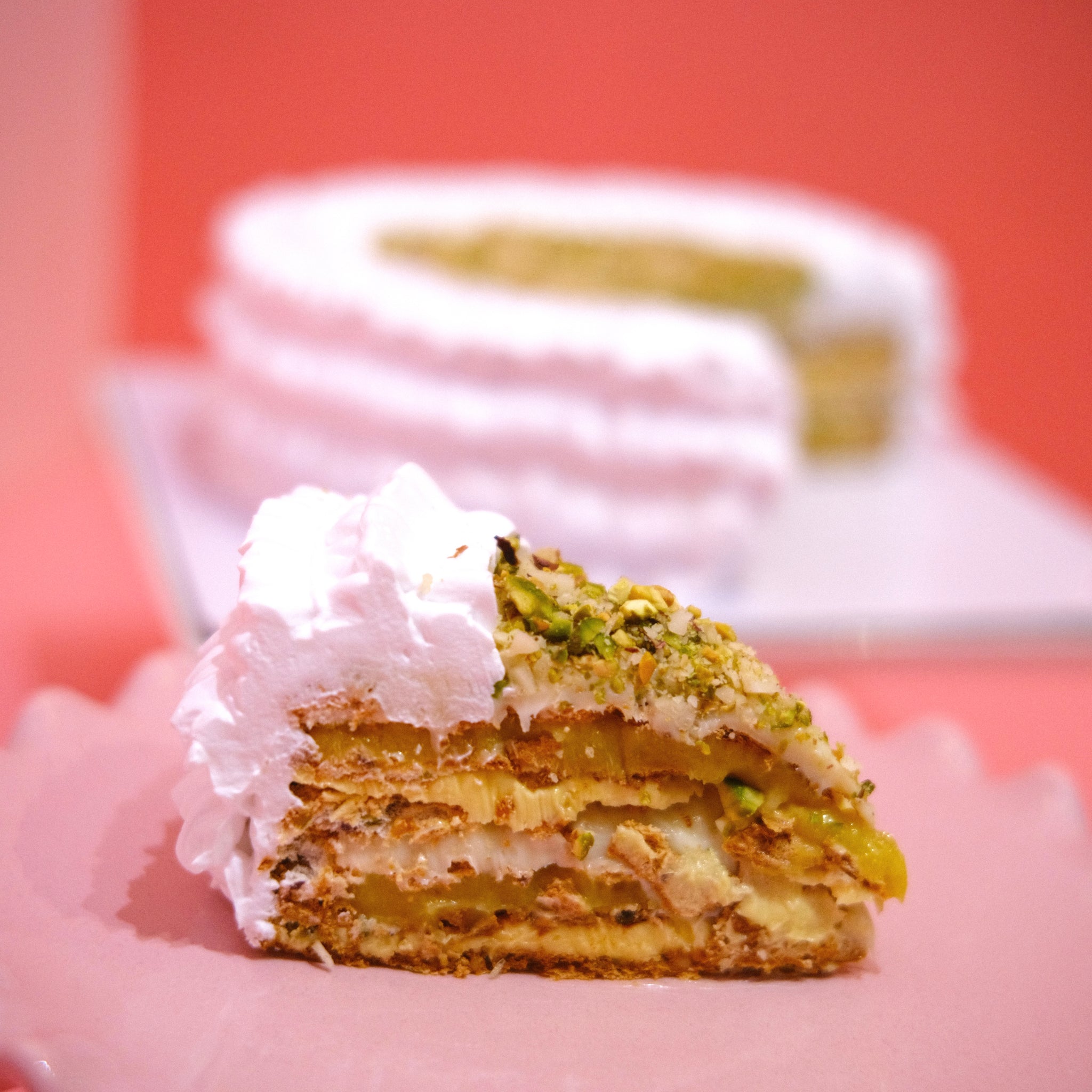 Cut a slice and find daquoise layers of pistachio & macadamia nuts, sweet butter, lemon curd, white chocolate ganache and enveloped in the dreamiest, whipped cream frosting.